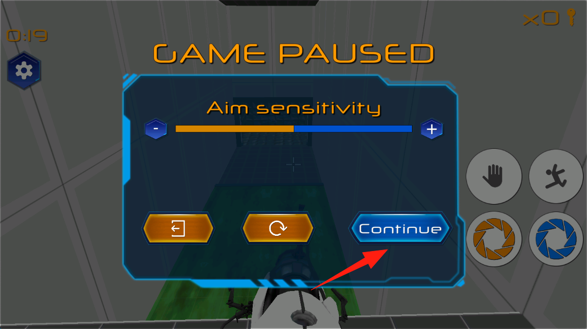 3、暂停时调整Aim-sensitivity瞄准灵敏度,点击Continue继续游戏,优化操作体验,点击继续。