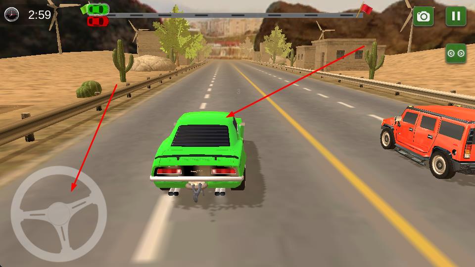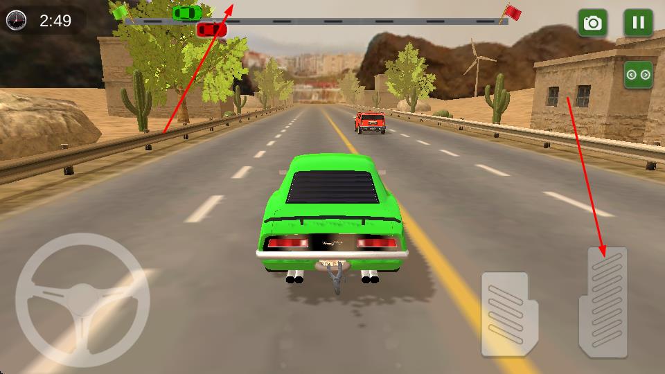 1、通过左侧虚拟方向盘操控车辆转向,点击右侧踏板控制加速,驾驶绿色赛车在公路开启竞速之旅。