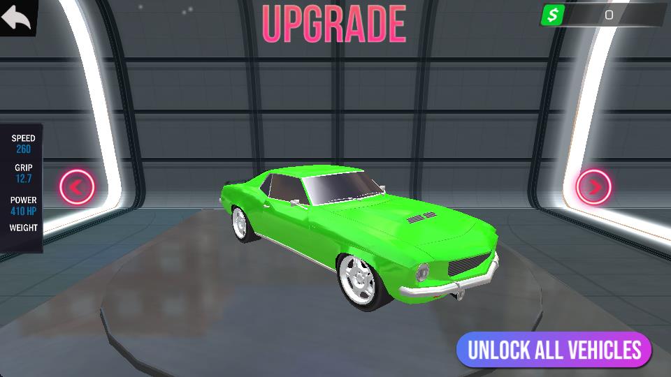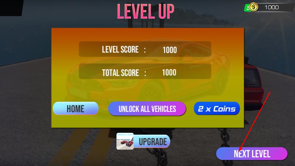 3、通关以后点击NEXT LEVEL按钮进入下一关,也可利用金币解锁车辆或升级性能,提升竞速能力。