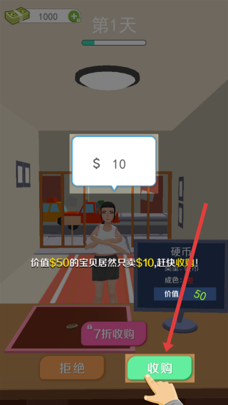 2、当顾客出售价值$50却标价$10的物品时,按照箭头指示,通过点击绿色收购按钮,购入该物品。