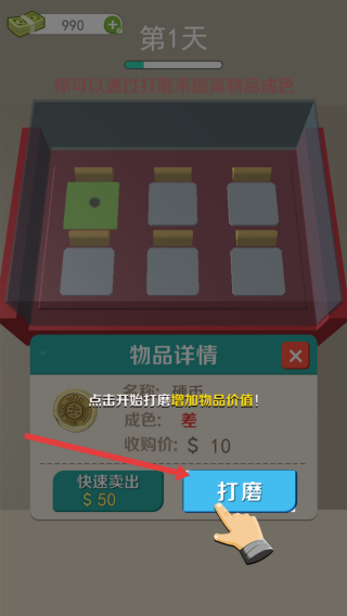 3、在进入物品详情界面,可以按照箭头指向处点击蓝色打磨按钮,提升物品成色,提升其后续售卖价值。