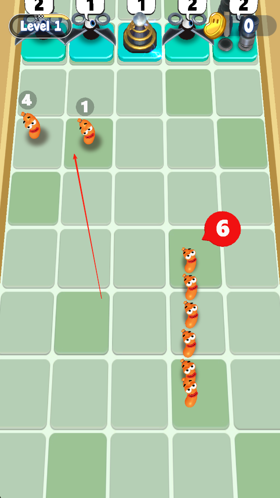 1、手指滑动屏幕控制香肠移动方向,在方格道路上避开带数字的障碍物,碰到会阻挡前进,沿着通道前行,尽量收集香肠壮大队伍。