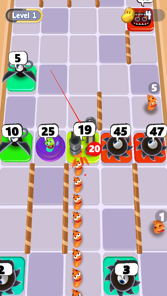 2、注意观察前方障碍上面的数字以及香肠头上的数字,选择比自己数字小的障碍即可顺利穿过。