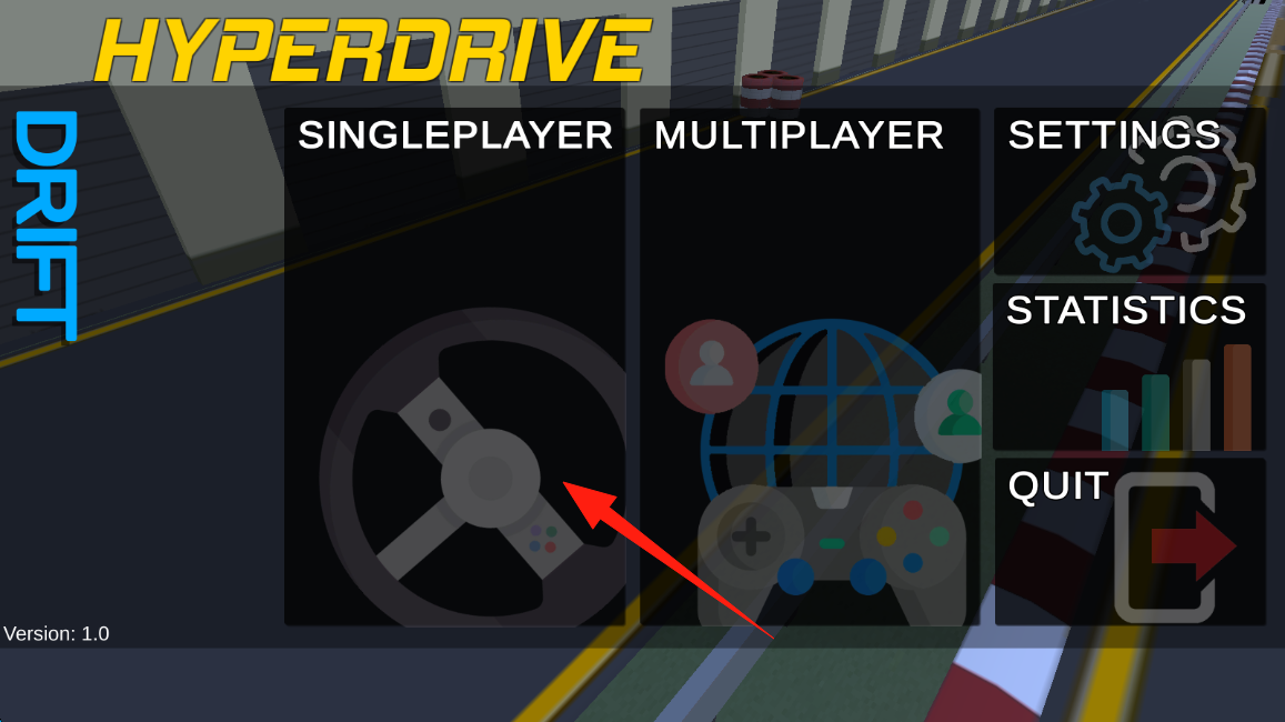1、点击SINGLEPLAYER单人模式,进入Hyperdrive-Drift游戏单人竞速,点击开始游戏。