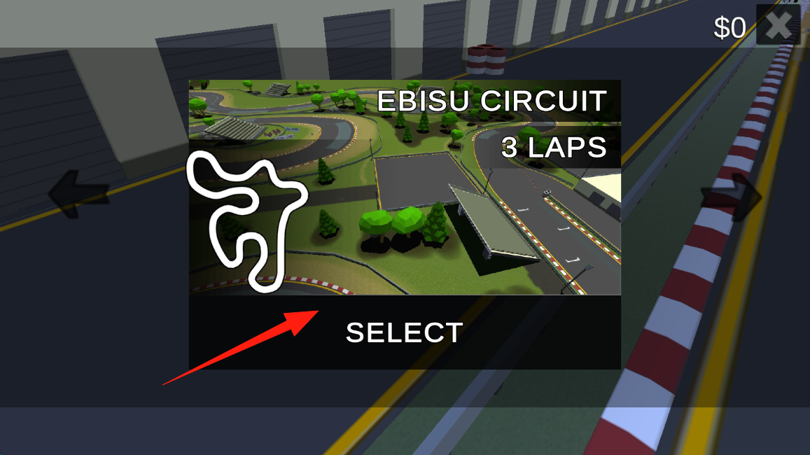 2、选择EBISU-CIRCUIT赛道,点击SELECT,开始3圈竞速挑战,点击选择游戏的关卡。