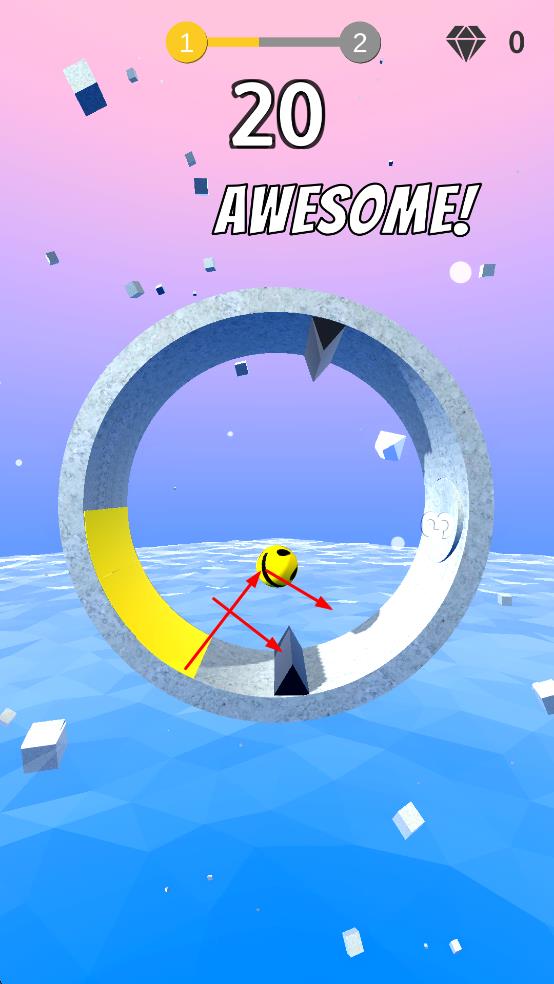 1、圆环跳跃精准操控:核心玩法是小球在圆环中跳跃,需在适当时候点击屏幕控制,既考验时机判断又需精准操作,每个圆环的间距与障碍物设置不同,让跳跃过程充满变数与挑战。