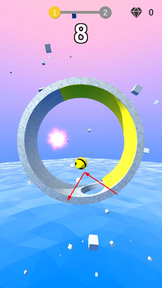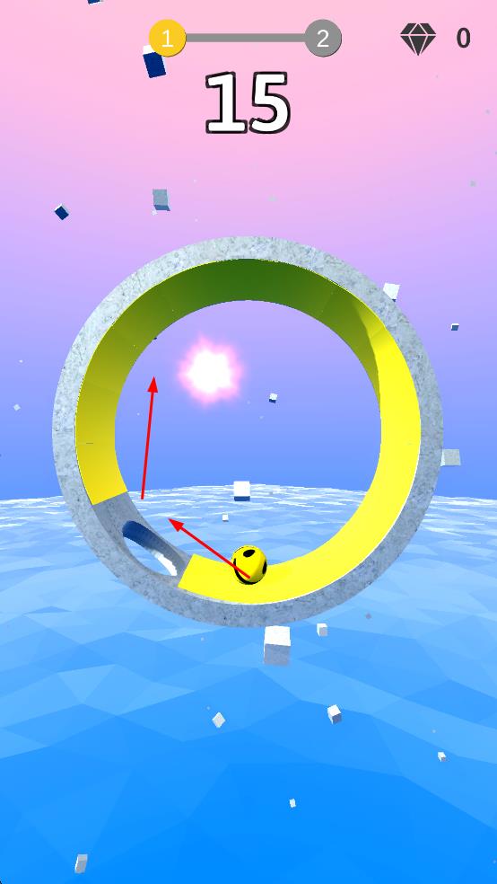 1、点击操控小球跳跃:通过点击屏幕控制小球在圆环中跳跃前进,点击时机决定跳跃高度与距离,需根据圆环位置与障碍物分布调整点击力度,确保小球准确落在目标位置。