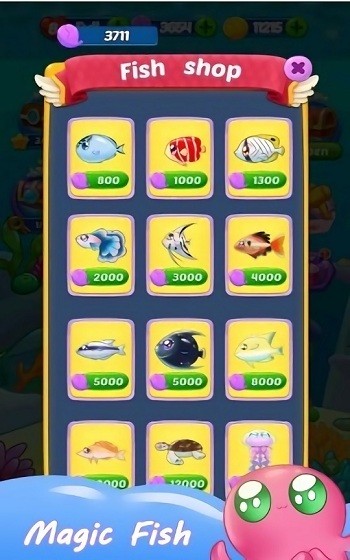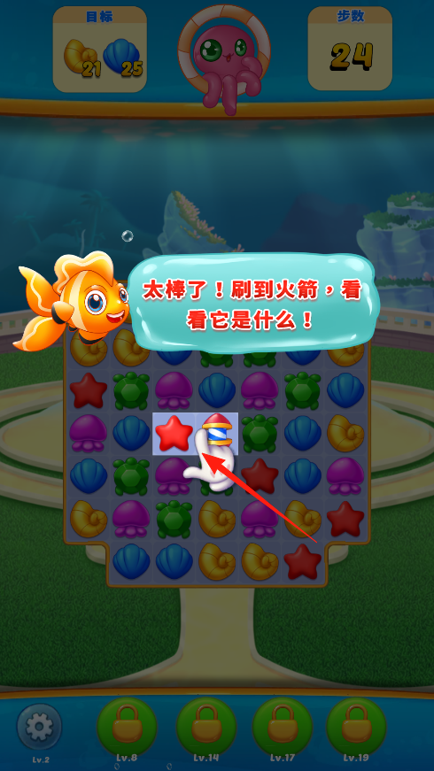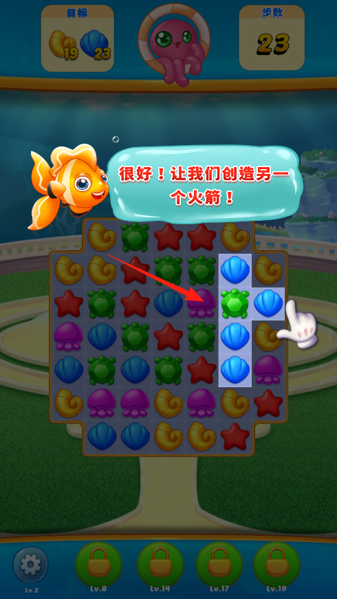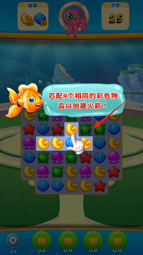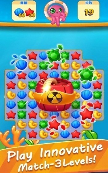 3、多样海洋元素呈现:包含海藻、章鱼以及各种可爱的鱼等多样海洋元素,这些元素不仅构成了消除的主体,还营造出浓郁的海洋氛围,让玩家在消除时感受魅力。