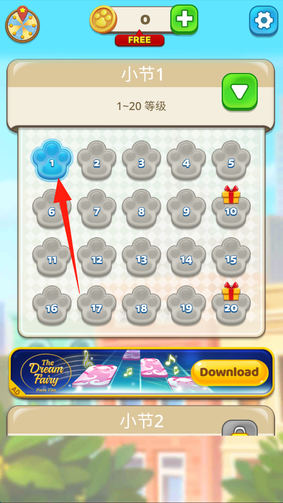 1、进入游戏界面,点击小节1中蓝色高亮的1号关卡,开启第一关的消除挑战之旅,点击选择关卡。