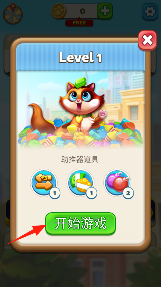 2、在Level-1准备界面,确认助推器道具后,点击绿色开始游戏按钮,进入消除关卡,点击开始。
