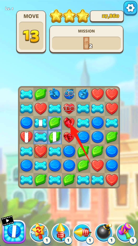 3、Lv.1消除关卡内,观察元素分布,交换相邻同类型元素,完成消除任务推进关卡。