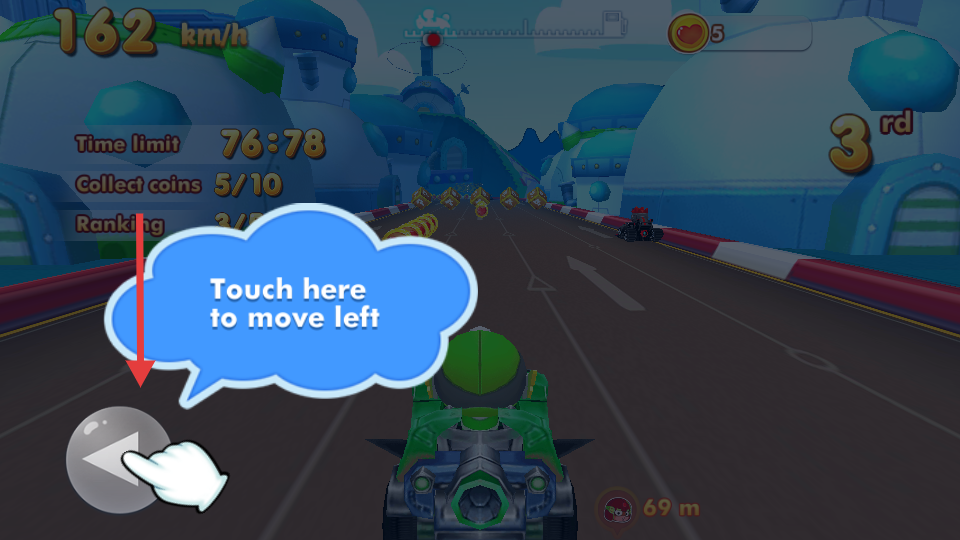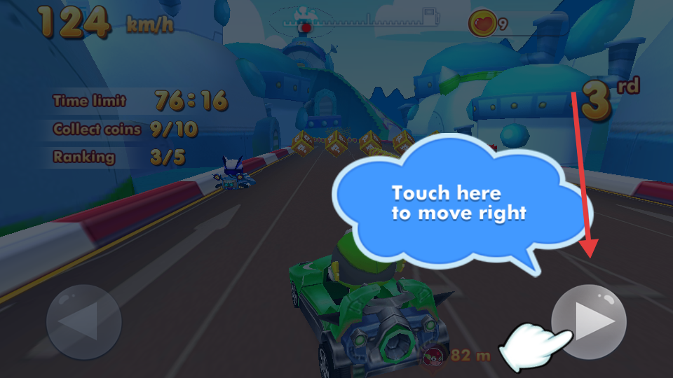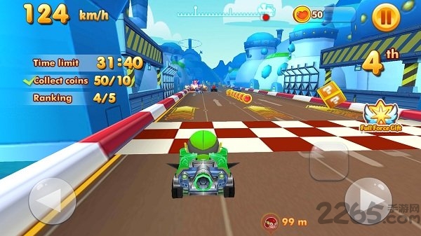 1、基础操控:通过重力感应控制方向,点击右侧喷射按钮触发氮气加速,左侧刹车按钮实现急转调头等基础操作。