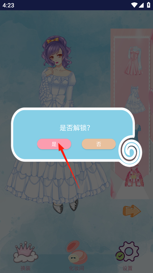 3、当你看到喜欢的服装时,弹出是否解锁的提示框,要是你想获得这件服装,就点击是按钮,这样就能解锁它,之后就可以给人物穿上啦。