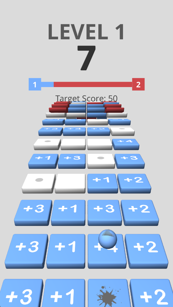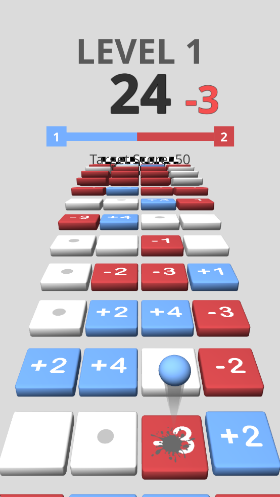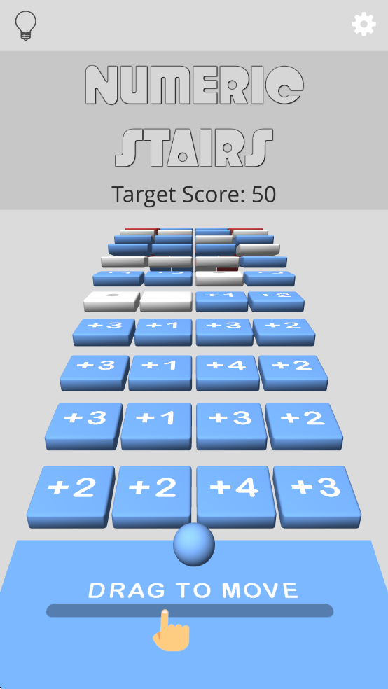1、用手指滑动屏幕控制小球左右移动,在数字方块组成的楼梯上跳跃前进,让小球准确落在方块上,触发方块的加减效果,累积分数。