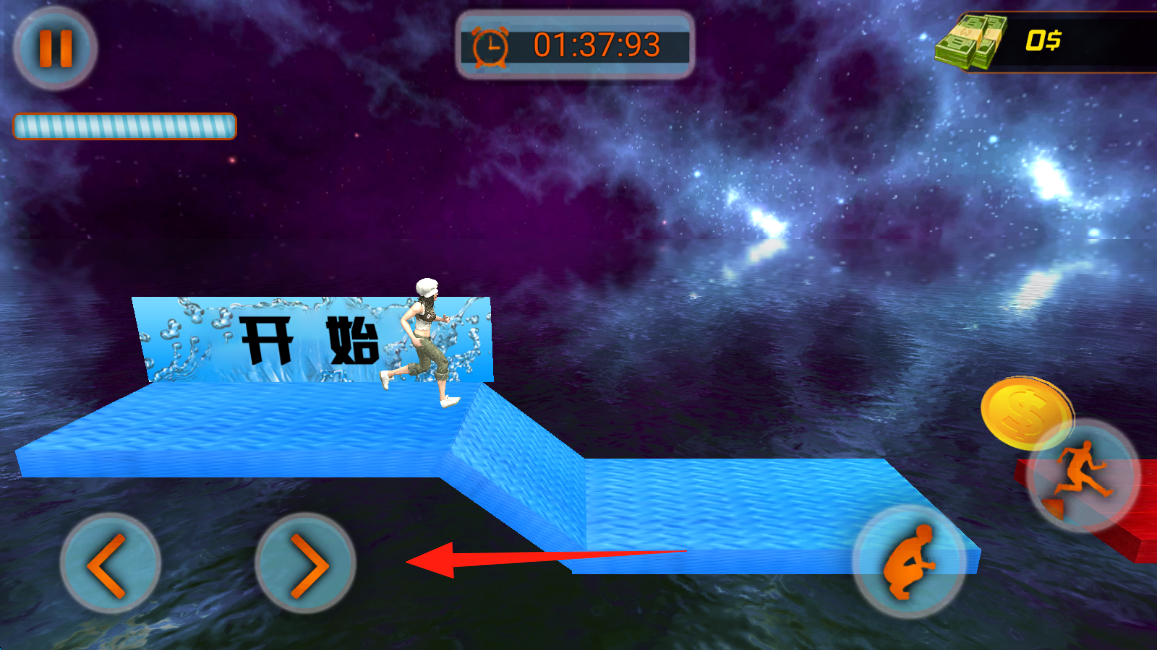2、跑酷时利用左右箭头按钮控制方向,躲避障碍,沿蓝色路径持续前进,点击按钮移动人物。