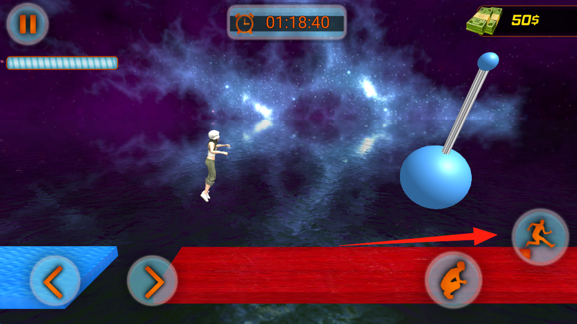 3、遇到红色路径等新地形,点击右侧跑步按钮加速通过,争取在限时内完成关卡,点击跳跃。