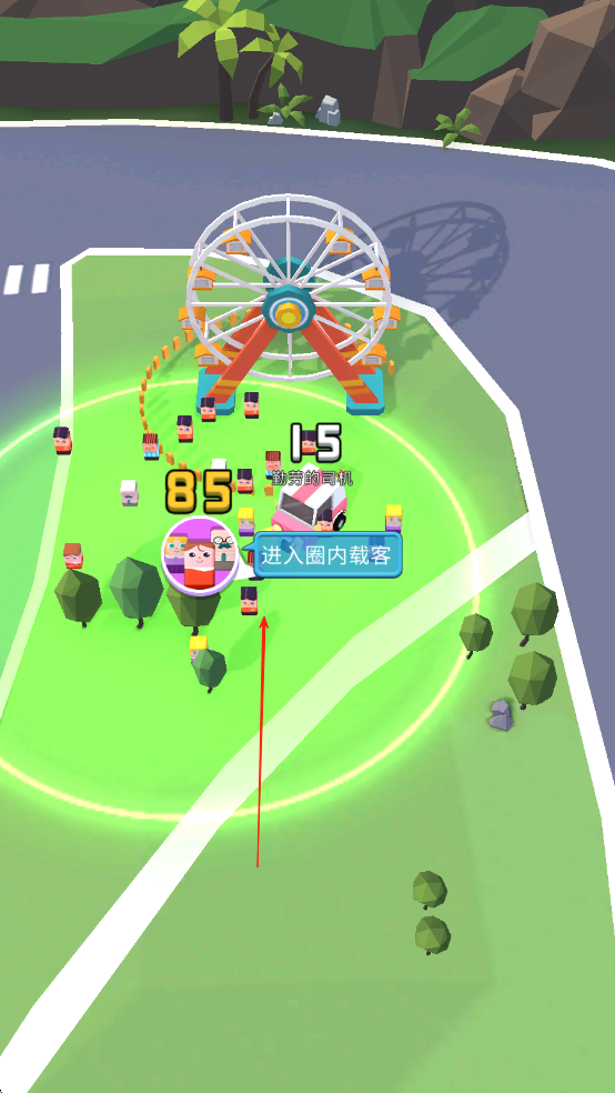 1、根据箭头指引找到乘客的位置,行驶小车快速进入圈内将乘客载上车,累积乘客数量。