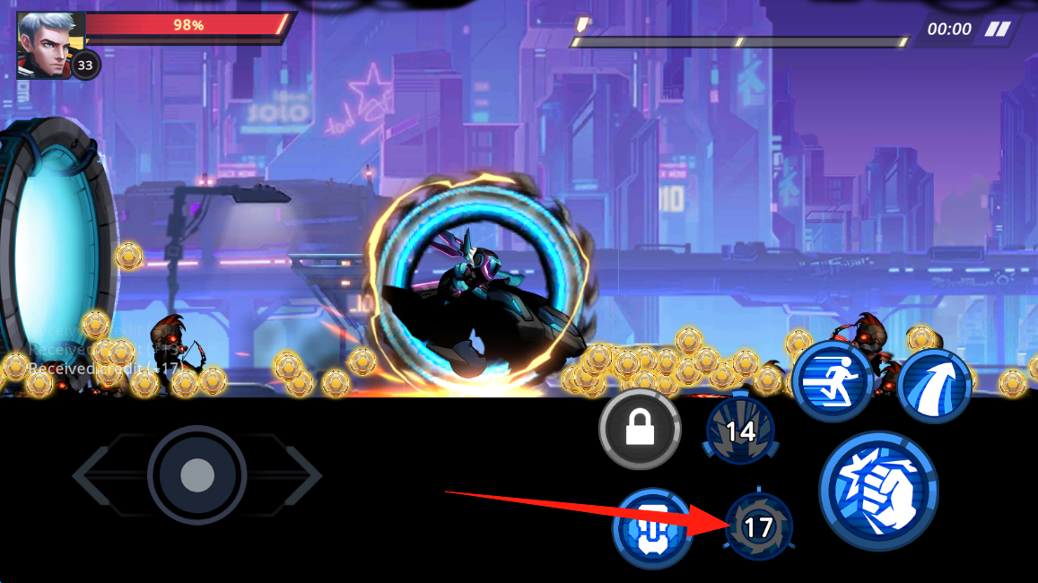 3、面对敌人,点击右侧技能图标,释放强力技能,消灭敌人并收集金币道具,点击使用技能。