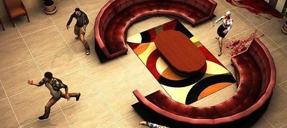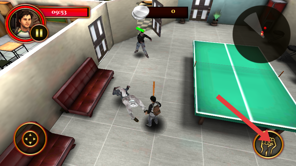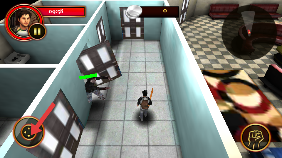2、战斗中利用沙发、乒乓桌等房间掩体,绕后攻击丧尸背部,减少自身受击,关注丧尸红、绿色血量条。