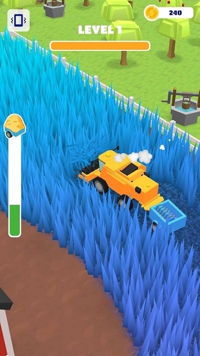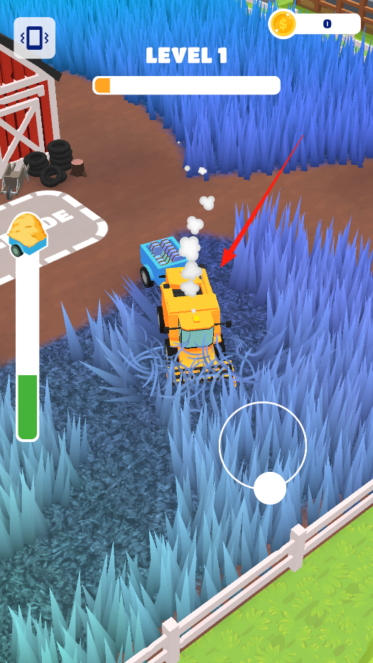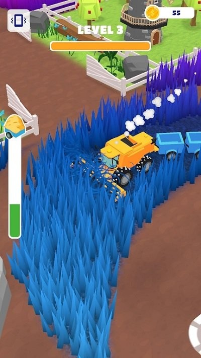 1、在第一关里,操控黄色的收割机在蓝色的草丛里移动,收割机走过的地方,草丛就会被收割掉,一边收割,一边看着进度条变化,朝着完成关卡的目标前进。