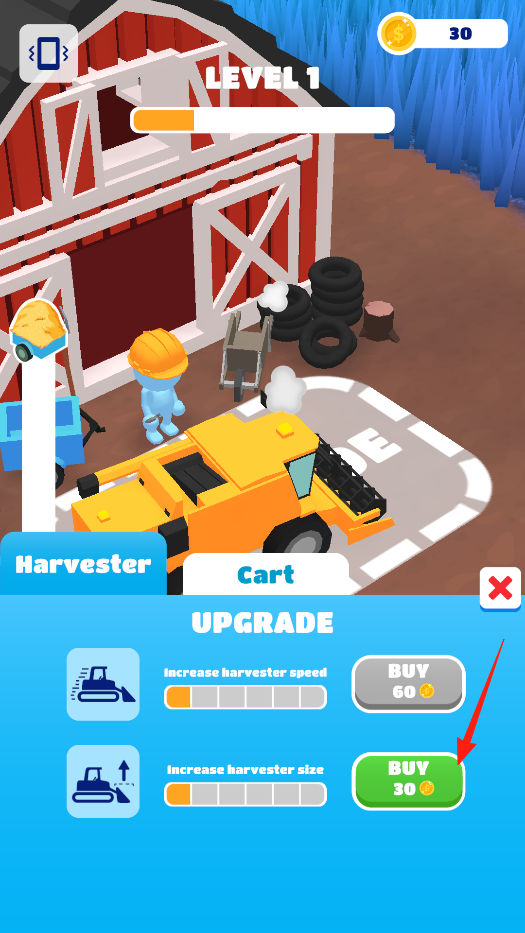 2、收割草丛获得金币后,来到升级界面,这里可以用金币升级收割机,比如花30金币能增加收割机的大小,这样收割机一次能收割更多的草丛,让游戏进程更快。