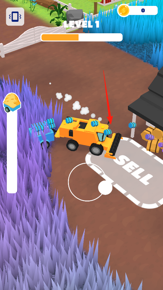 3、开着收割机收割完草丛,收集好收获的东西后,把收割机开到标着SELL的区域,这里可以卖掉收割来的物品,换取金币,继续游戏。