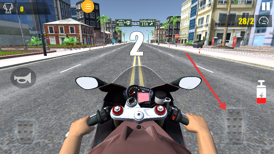 1、通过虚拟方向盘或重力感应控制摩托车方向,保持高速行驶避开障碍物。