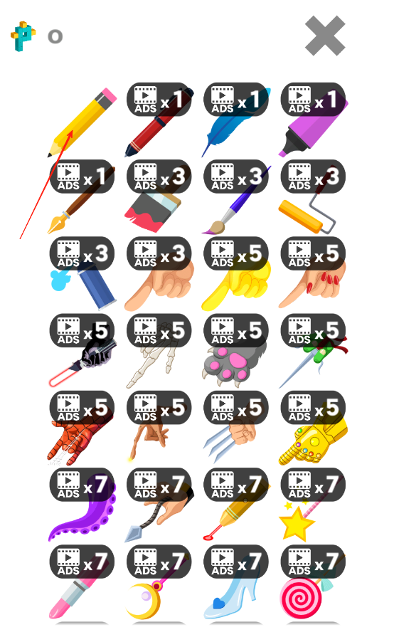 3、进入工具界面,点击不同画笔如铅笔、羽毛笔等观看广告可解锁使用,不同画笔用于填色操作。