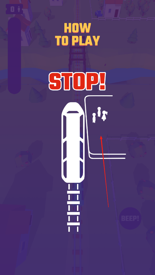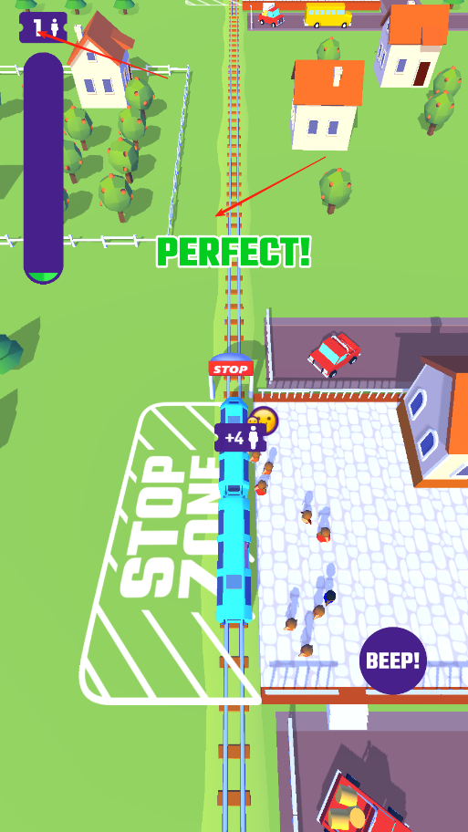 1、观察停车站行人与火车位置,在合适时机点击苹果,让火车停下,避免撞到行人,成功停下可搭载乘客推进任务进程。