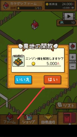 3、弹出農地の開放确认框后,点击橙色はい按钮,花费5000金币解锁洋葱田,拓展种植区域,助力农场进一步发展。