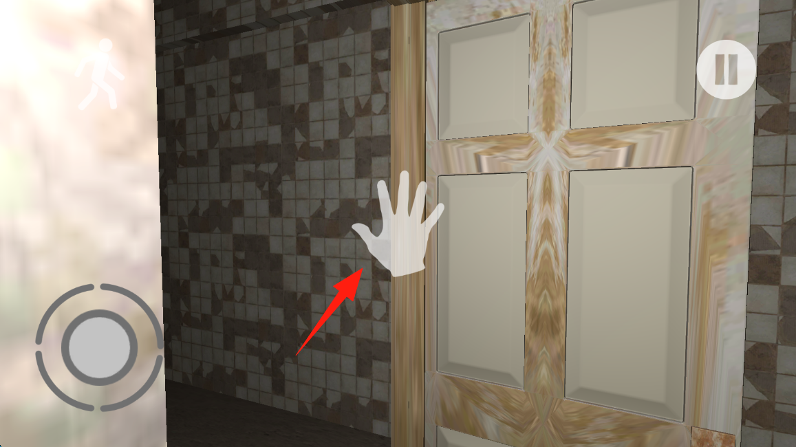 3、遇到门时,点击手型互动图标开门,避开邪恶护士,探索新区域推进游戏,拨动轮盘移动人物。
