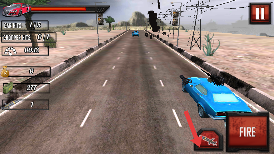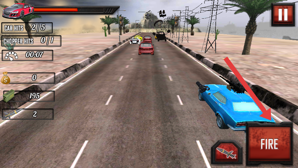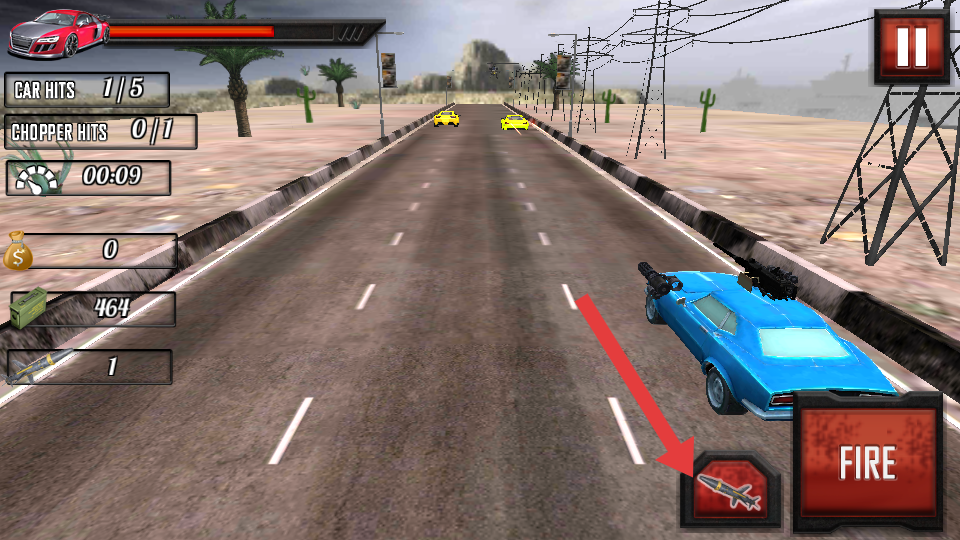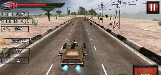 2.遇到前方车辆,点击右下角FIRE进行射击,或者用导弹键摧毁,躲避直升机空袭,利用道路宽度。