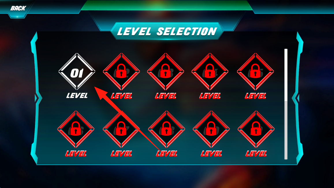 2、选择解锁的LEVEL 01关卡,进入未来城市场景执行任务,点击选择当前的游戏关卡。