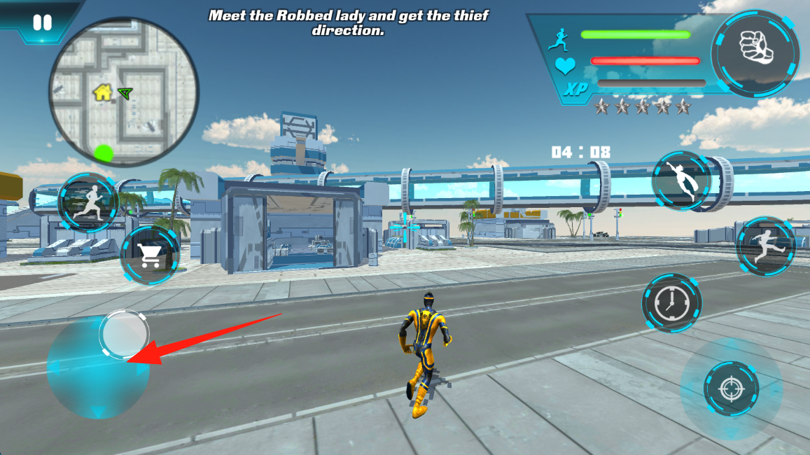 3、通过左侧虚拟摇杆控制英雄移动,按任务提示找到被抢劫女士,获取小偷方向,推进剧情。