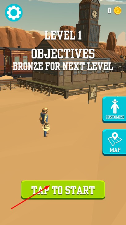 1、进入LEVEL1,点击TAP TO START开始,操控牛仔与白马。