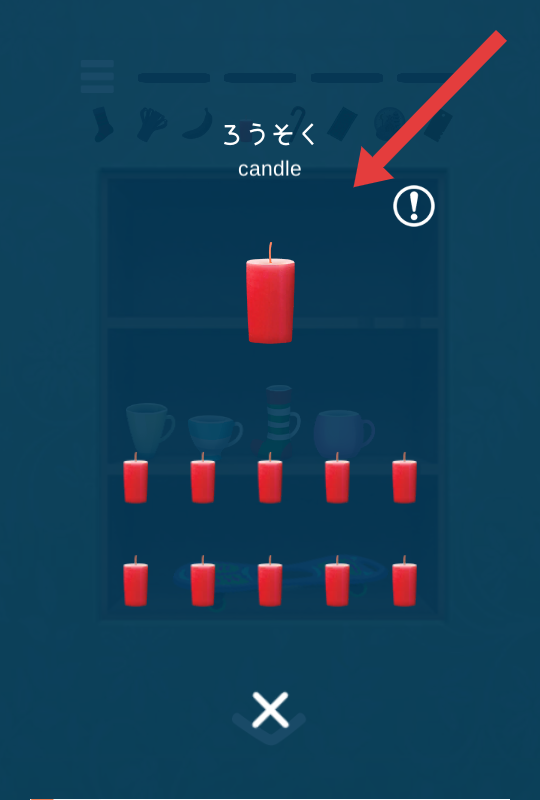 1、找到红蜡烛物品,识别上方标注ろうそくcandle,按照提示关联下方的同类物品,完成物品匹配任务。