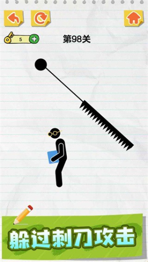 2、创意十足的关卡挑战,随着游戏进程推进,难度逐步提升,玩家需巧妙绘制武器或障碍物,帮助火柴人脱离险境,考验策略与应变能力。