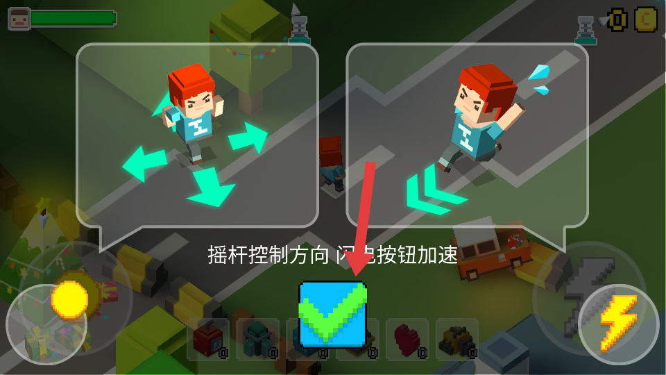 1.进入了游戏的场景,按照提示用摇杆来控制角色的方向,点击加速的按钮冲刺,熟悉移动的操作。