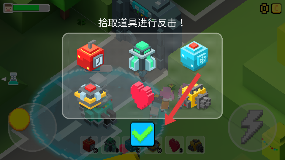 2.遇到道具拾取提示,靠近红、蓝等方块道具时钟、机器人,点击拾取,存入道具栏,用于反击。