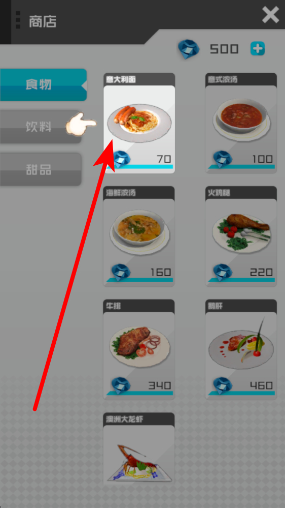 3、进入商店,依据分类选择食物商品,如食物栏选意大利面等,消耗对应资源购买,获取物品,丰富角色校园生活,持续深入体验。