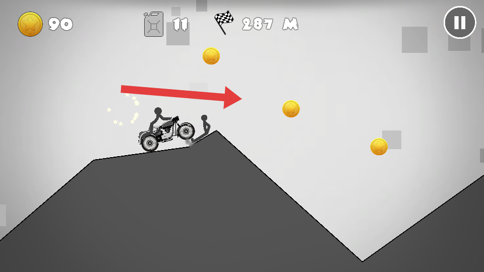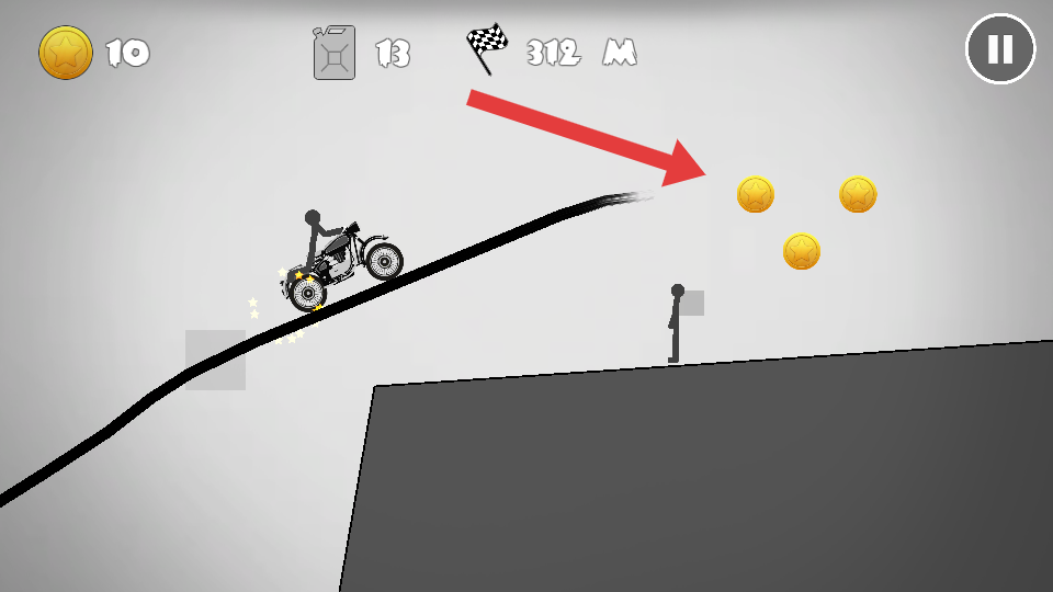 2.遇到陡坡、沟壑,提前调整摩托角度前倾或者后仰,借助地形加速下坡或跳跃腾空,避开路上火柴人障碍,防止翻车。