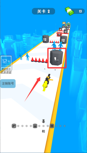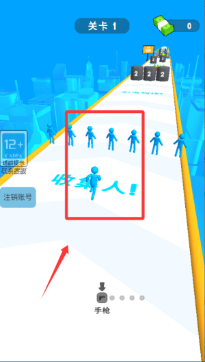 1、进游戏先往前跑,路上的小人会自动跟在你后面。多收集几个,队伍变长才能组合成武器打敌人。