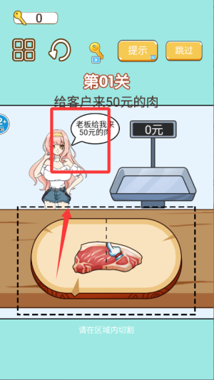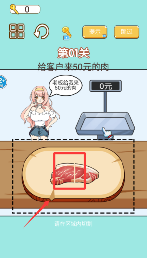 1、进游戏先看顾客要多少克,比如300克或500克。拿起刀对准食材,准备开始切,别切多了。