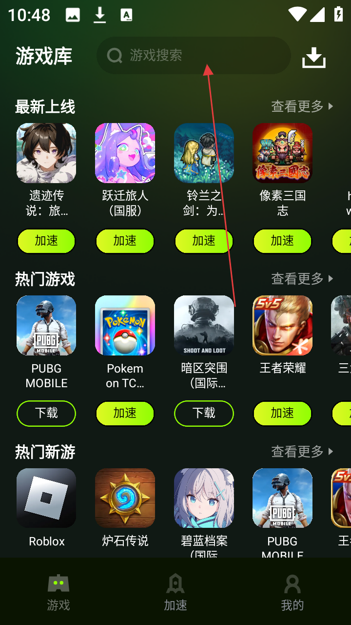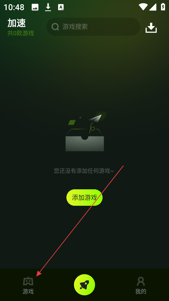 1、下载安装好软件后打开,在首页点击游戏,进入游戏库页面。