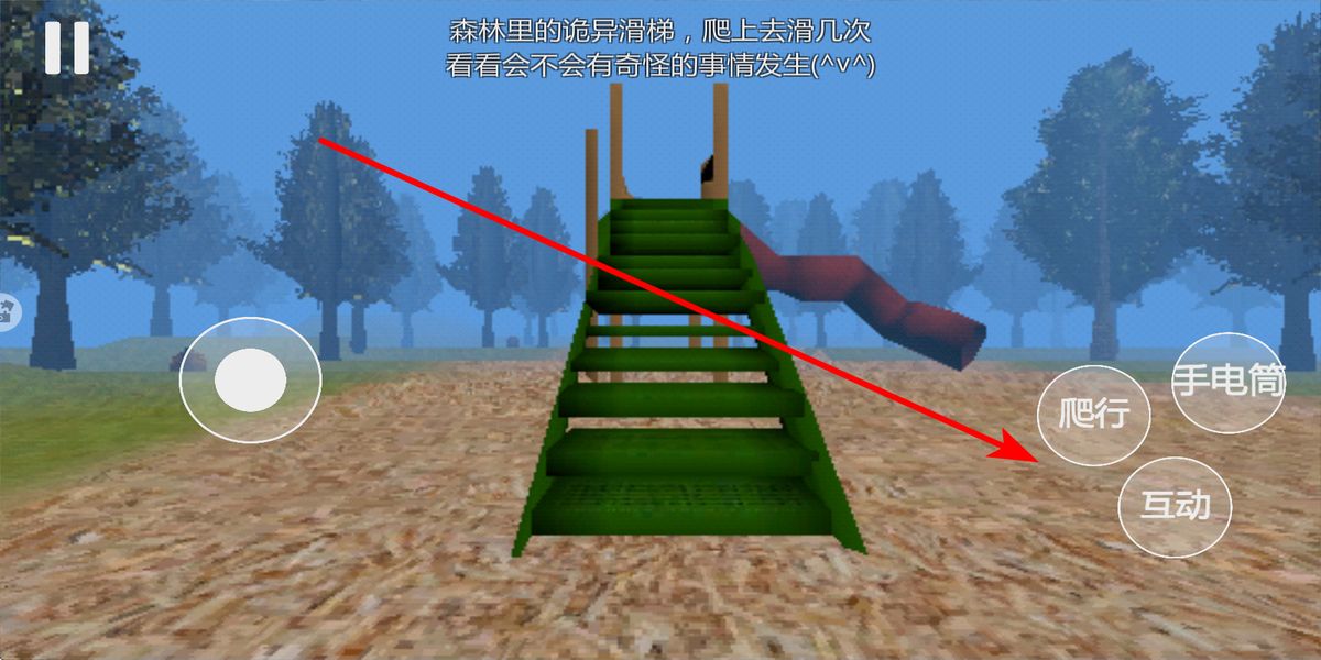 2、在滑梯场景,依据提示爬上去滑几次,点击爬行按钮,操控角色沿滑梯攀爬、滑行,留意过程中异常,收集潜在线索,推进探索进程。
