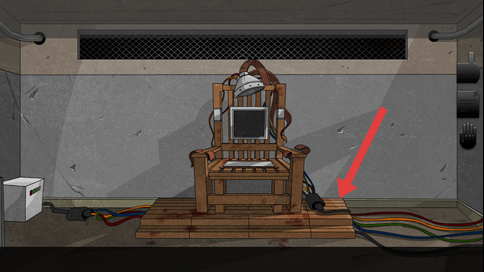 1、进入房间,观察电椅及彩色电线,点击电椅旁黑色插头,尝试连接对应线路,为电椅供电做准备。