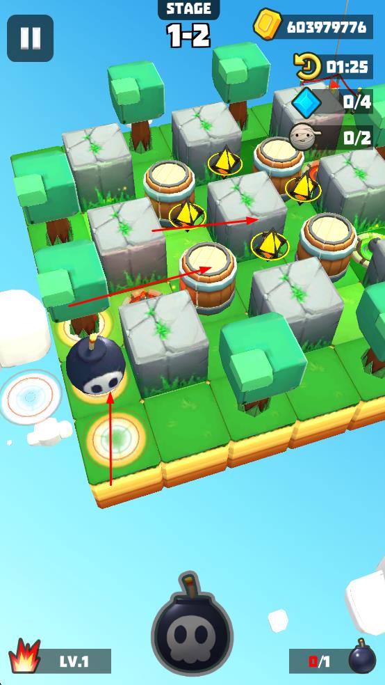 2、瞄准木桶、障碍等目标放置炸弹,利用爆炸清除障碍,同步收集场景中的钻石。