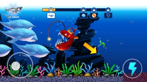 4、通过手指滑动控制鲨鱼在海底尽情吞噬,获取能量成长变大。简单的操作方式让玩家能够轻松上手,专注于游戏的核心玩法。
