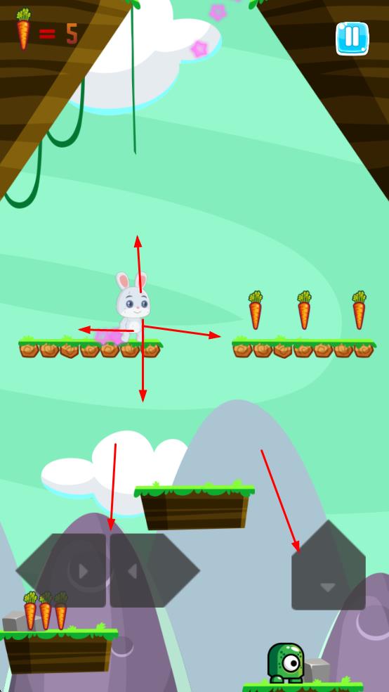 1、操控兔子上下左右移动,收集场景胡萝卜,留意怪物位置,开启冒险进程。