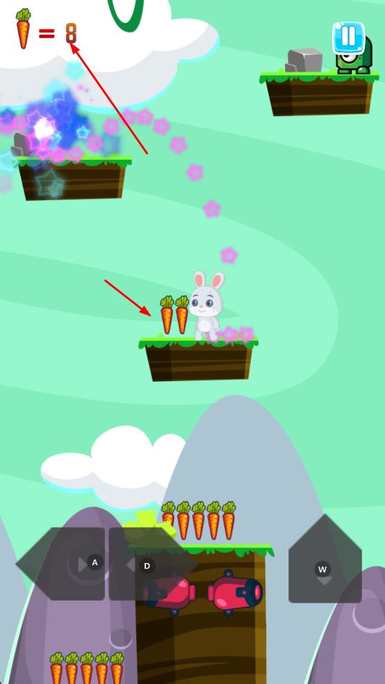 2、借助平台跳跃跨越障碍,获取高处胡萝卜,提升收集数量,推进游戏流程。